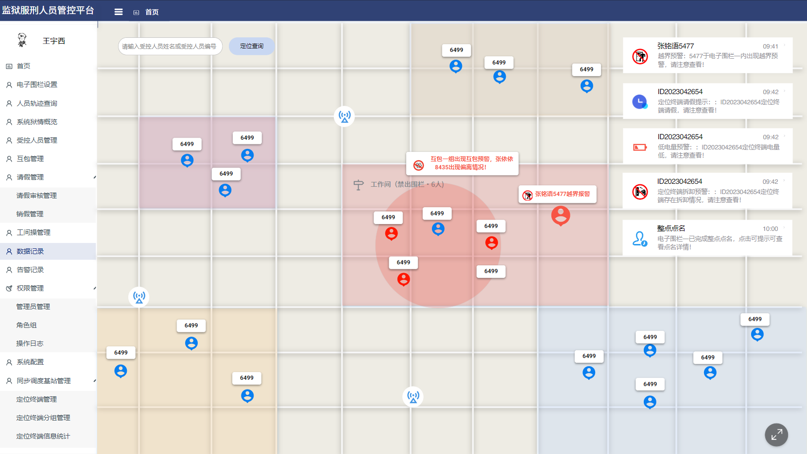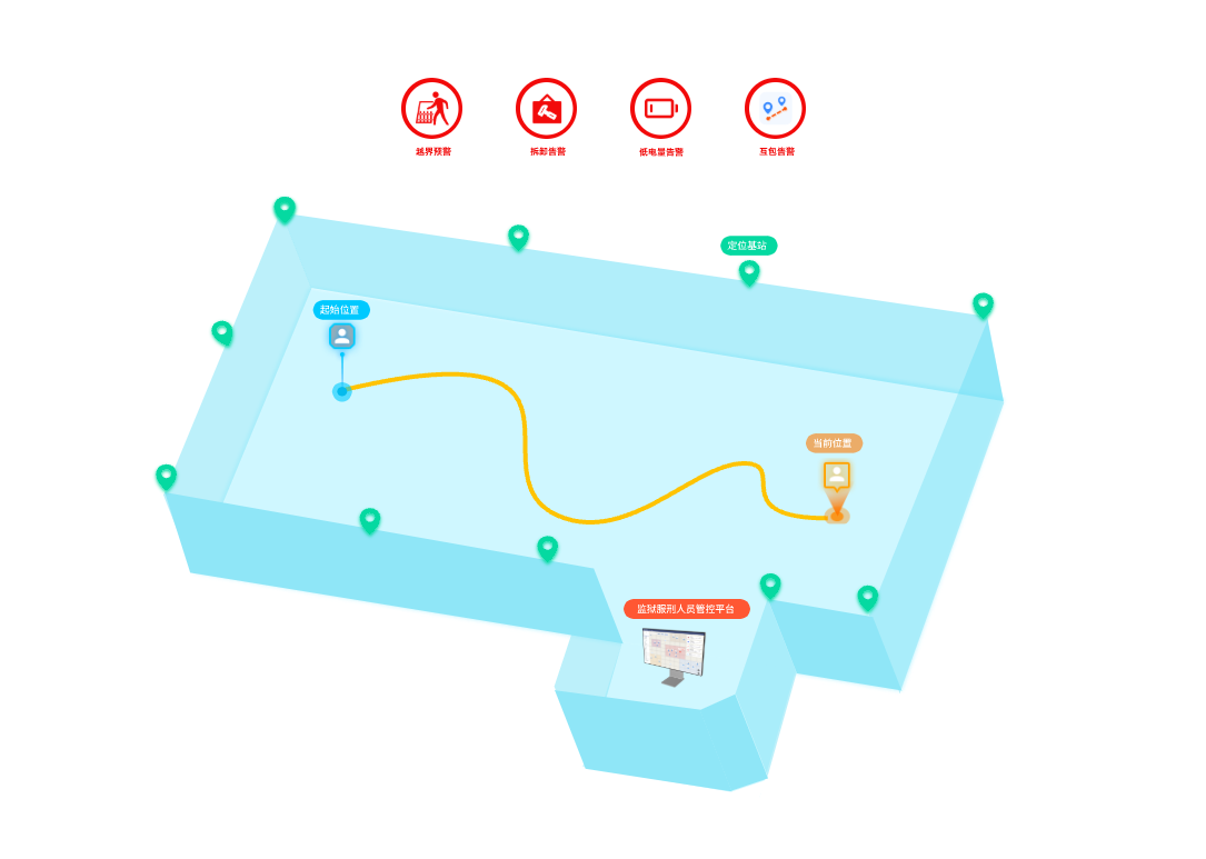 采用定位技术,将人员定位、轨迹查询跟踪、突发情况预警、电子围栏等功能融合至监狱服刑人员管控平台中,实现监区的全面覆盖,实现监狱高效智能化管理。