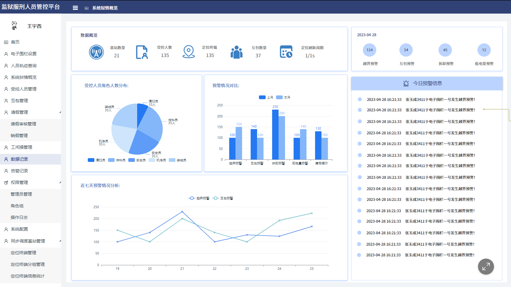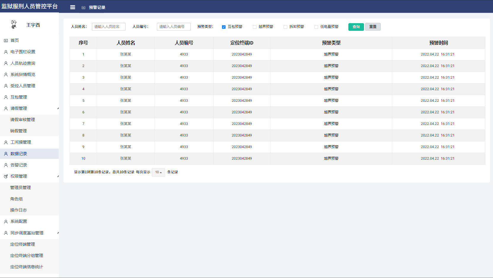 平台实时持续接收设备的状态、定位异常情况,当定位手环出现拆卸、低电量、定位越界、互包距离过远等异常情况,平台将会第一时间发出声音及推送报警信息等方式提醒监管人员关注
