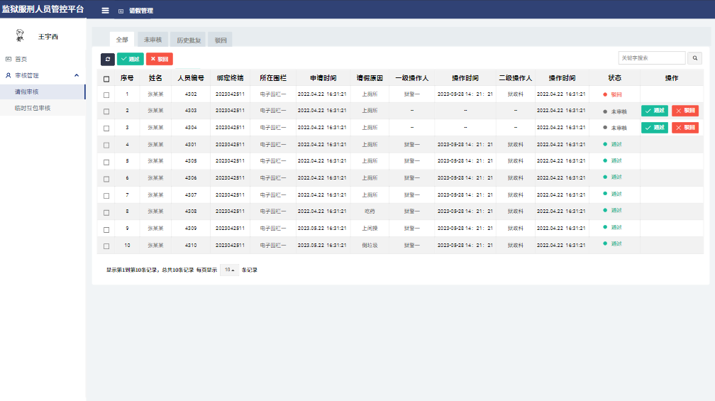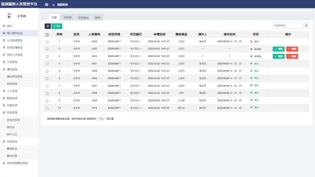 受控人员通过手环可自主请假,请假信息经狱警及狱政科二级审核通过后,方可暂时解除围栏绑定状态