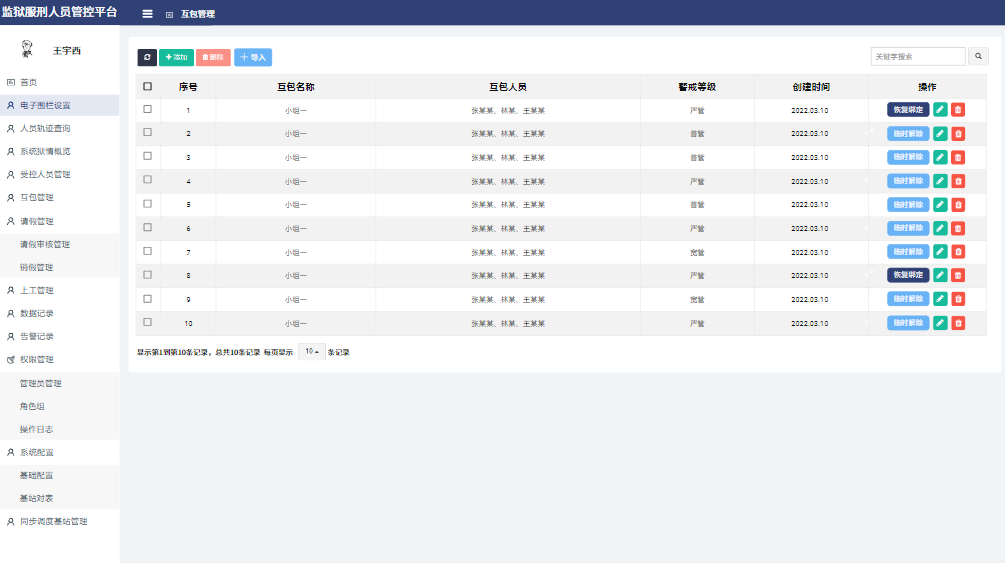 系统支持创建互包及临时互包两种类型的互包关系,当受控人员的距离超出设定阈值时,平台将会第一时间发出声音及推送报警信息等方式提醒监管人员关注