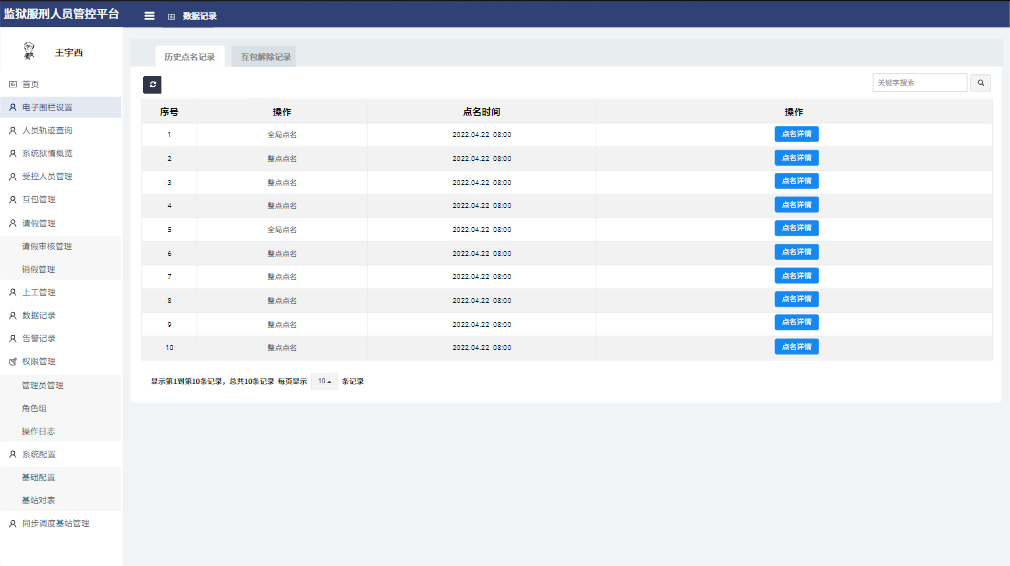 系统支持围栏点名、全区域点名、整点点名三种点名方式,点名后即可查询当前围栏、全区域及整点时间全区域的受控人员人数及人员名单