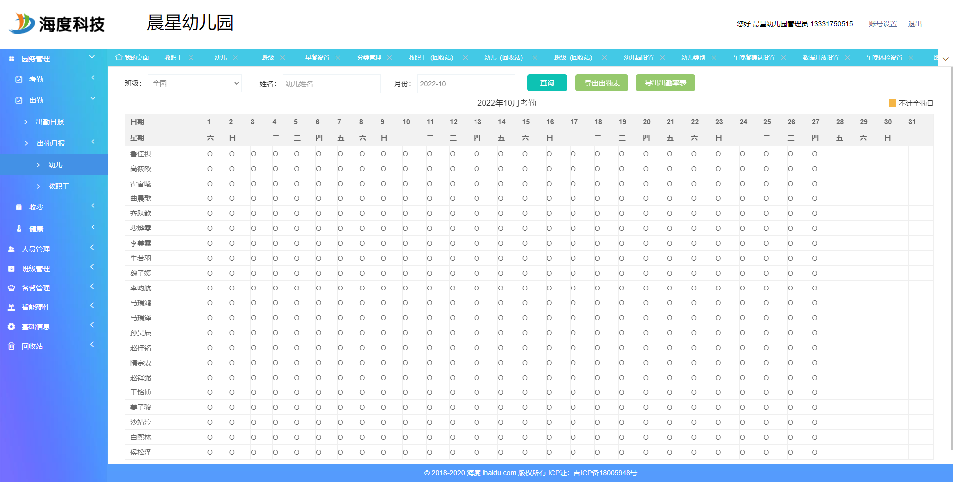统计教师及幼儿的出勤情况,显示出勤日报、出勤月报