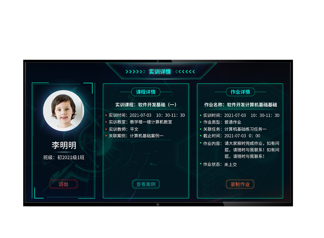 通过桌面实训一体机、头戴授课终端、移动智能终端和手机APP,实现中高职院校学生的实训监督、记录、指导、评价四大方面的智能管理。